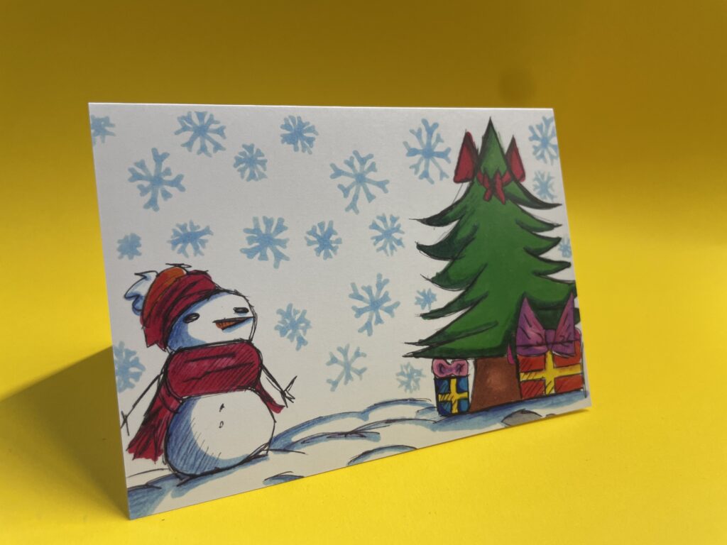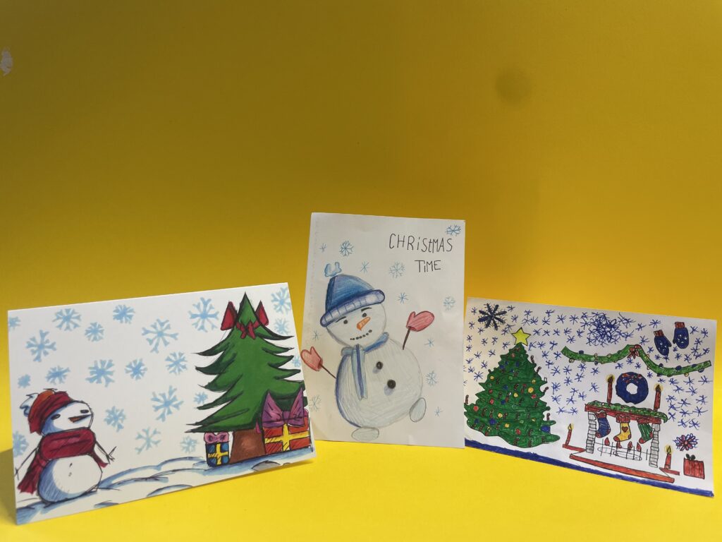 Von den vielen Karten, die von den Kreativen abgegeben wurden, hat sich das Schulleitungsteam in diesem Jahr für die Karte von Elena Wiebe aus der 6e entschieden. Die Karte von Elena zeigt eine winterliche Landschaft mit einem Weihnachtsbaum, Geschenken und einem Schneemann. Platz 2 ging an Bastri (5c), ein Kamin mit weihnachtlicher Dekoration und einem Weihnachtsbaum als Motiv und Platz 3 an Sabah (7e), diese Karte zeigt einen fröhlichen Schneemann.
