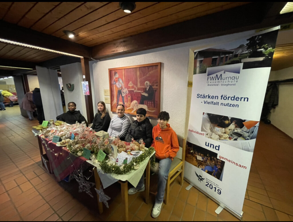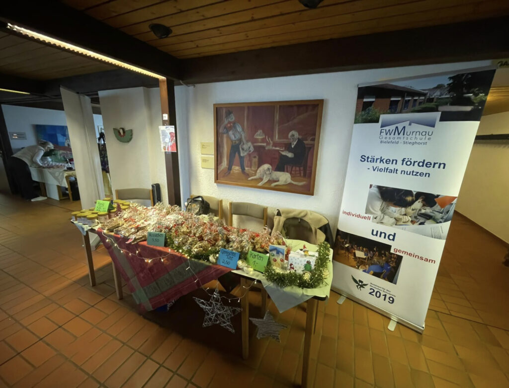 Der Weihnachtsmarkt im Gemeindehaus Stieghorst war auch in diesem Jahr (29.November 2025) ein voller Erfolg und zog viele Besucherinnen und Besucher an. Bei weihnachtlicher Dekoration, festlicher Stimmung und dem Duft von frisch gebackenen Plätzchen fühlten sich alle sofort auf die Adventszeit eingestimmt. Ein besonderer Anziehungspunkt war natürlich unser Stand, der direkt am Eingang zu finden war. Dort verkauften die Schülerinnen und Schüler mit großem Engagement selbstgebackene Butterplätzchen, Cookies und Nussecken, die bei den Gästen sehr beliebt waren. Zusätzlich wurde leckeren Honig der Imker-AG angeboten, der ebenfalls großen Zuspruch fand. Der Honig stammt von schuleigenen Bienenstöcken, die in einem Umkreis von 3,5km um die Schule ihre Nektar sammeln. Dank der guten Nachfrage konnten wir erfolgreich verkaufen. Der Markt war insgesamt sehr gut besucht, die Besucherinnen und Besucher hatten sichtlich Freude am Bummeln, Probieren und Beisammensein. Die festliche Atmosphäre machte den Weihnachtsmarkt zu einem schönen Erlebnis. Ein Besuch im Gemeindehaus Stieghorst lohnt sich jedes Jahr und ist eine wunderbare Einstimmung auf die Weihnachtszeit. 🎄Ein besonderer Dank geht an die engagierten Verkaufshelfer:innen der Klasse 7a. Mit viel Freude und beeindruckenden Verkaufstalenten sorgten sie dafür, dass unser Stand ein echter Hingucker war. Bis zum nächsten Jahr!
