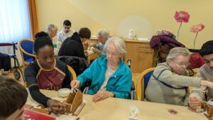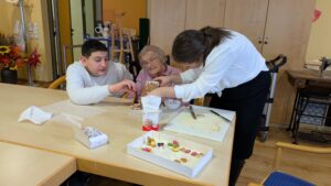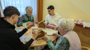 Die Schüler*innen, die die Bewohner*innen einmal die Woche besuchen, hatten in die Weihnachtsbäckerei eingeladen, um mit den Bewohner*innen zusammen kreativ zu werden. Dieses Mal wurden auf den Vorschlag einer Schülerin hin Lebkuchenhäuser gebaut.