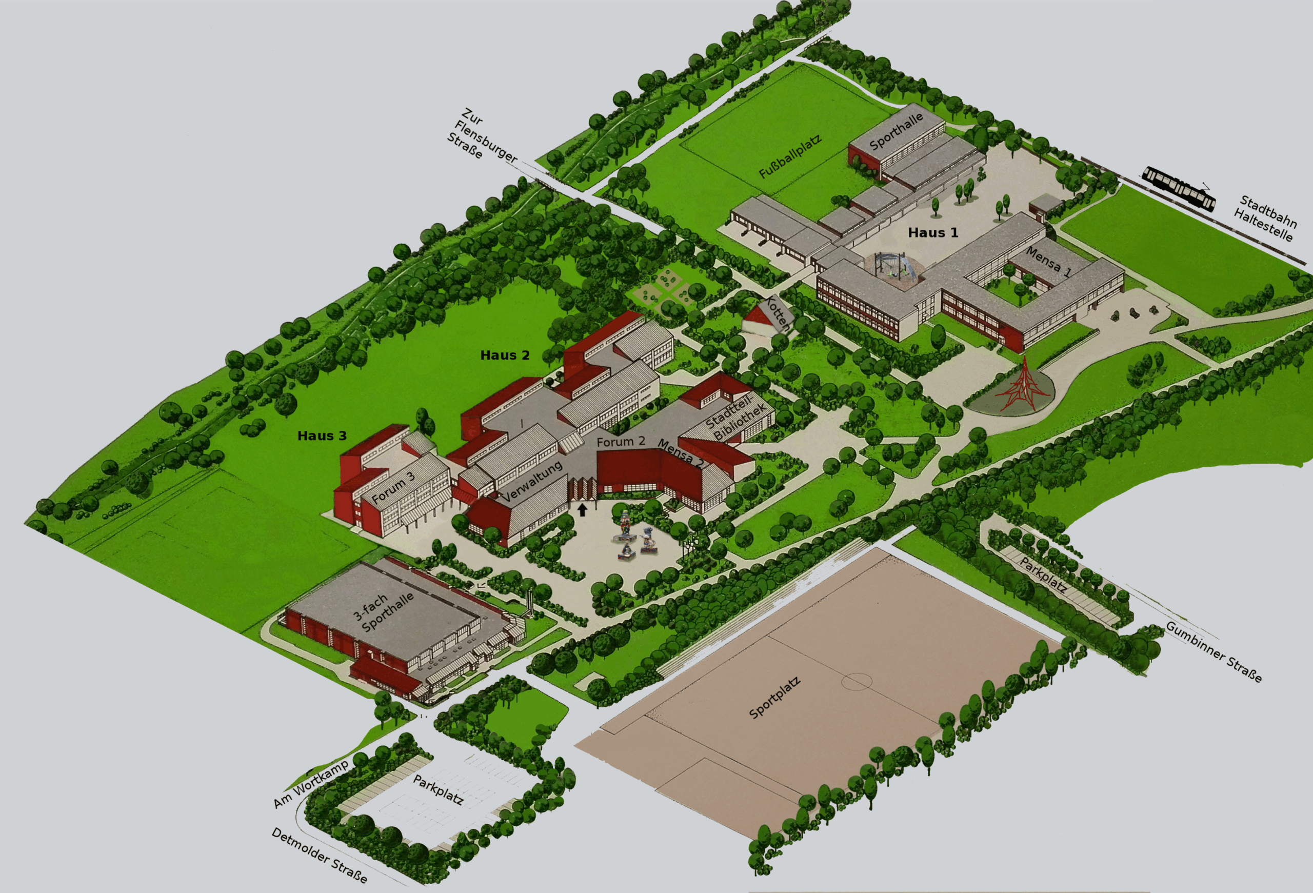 Unser großer Schulkomplex ist eingebettet in eine Grünanlage mit angrenzender Stadtbahnhaltestelle (Stieghorst Gesamtschule).