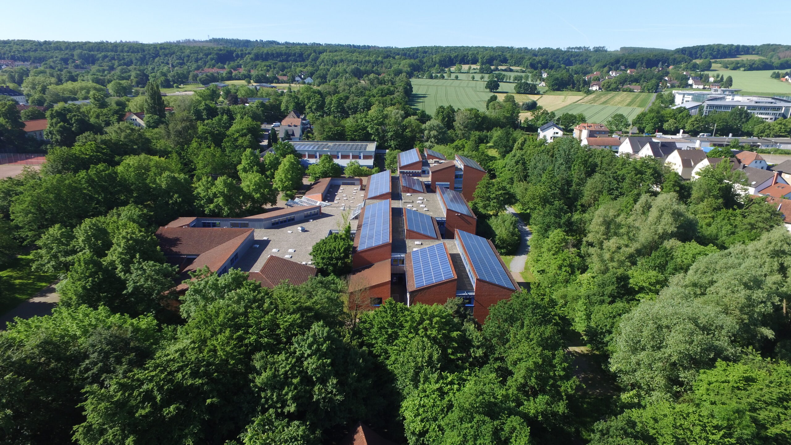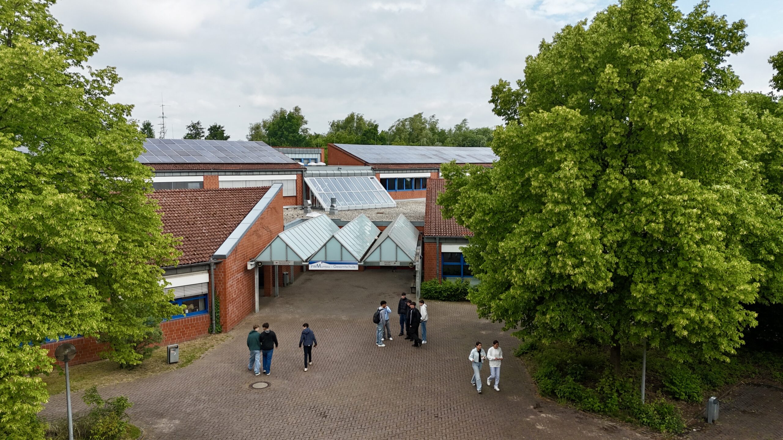 Unser großer Schulkomplex ist eingebettet in eine Grünanlage mit angrenzender Stadtbahnhaltestelle (Stieghorst Gesamtschule).