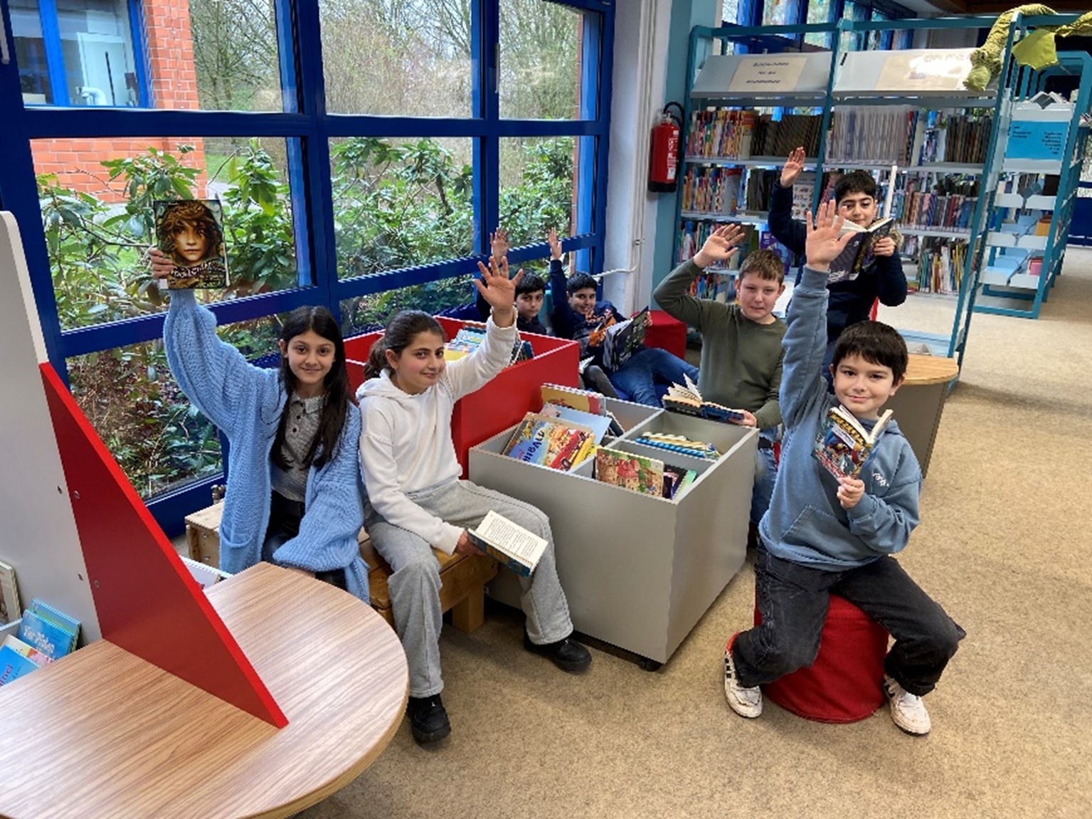Unsere große Stadtteilbibliothek bietet unseren Schüler*innen einen hohen Komfort und den Zugang zu zahlreichen und unterschiedlichen Medien sowie genug Raum und Nischen zum Lesen, Spielen und Entspannen oder auch, um sich weiterzubilden und zu lernen. Recherchearbeit in den Büchern oder an den Rechnern ist ebenso möglich. Materialien für ein Referat oder ein Portfolio können hier gedruckt werden. Bücher, Hörbücher und auch Spiele können mit dem entsprechenden Ausweis ausgeliehen werden.