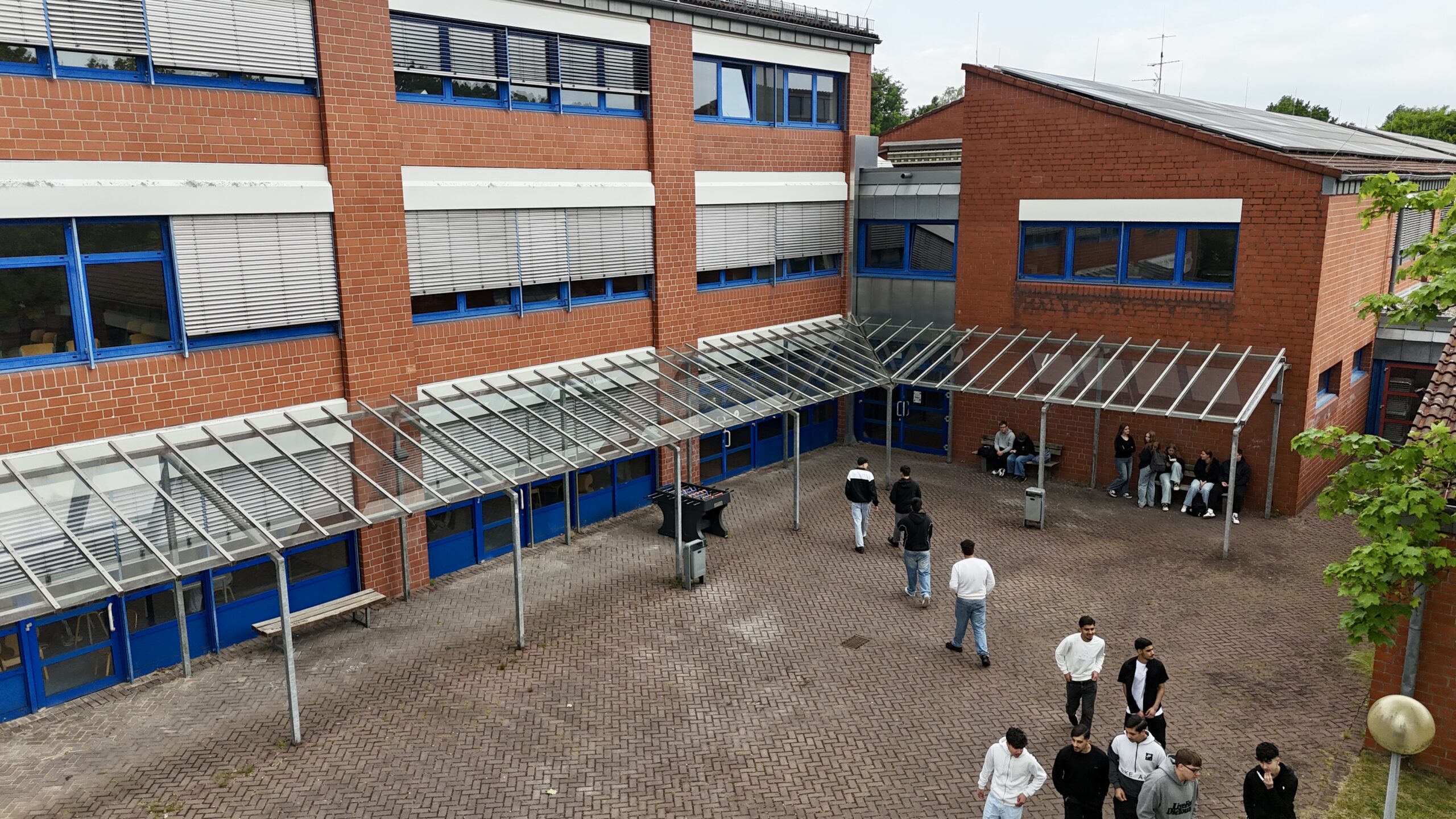 Zusätzlich gibt es auch hier eine Mensa, einen großen Schulhof mit Basketballkörben und Tischtennisplatten, das Forum mit Bühne für Unterricht in „Darstellen und Gestalten“ bzw. Literatur in der Oberstufe und natürlich auch für sämtliche Veranstaltungen an unserer Schule.