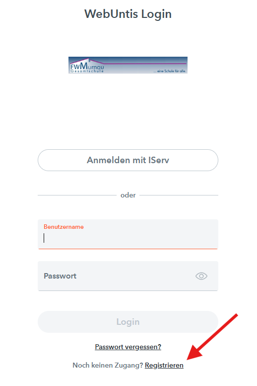 • Danach muss man auf den Link „Registrieren“, unterhalb der Anmeldefelder von WebUntis, klicken.