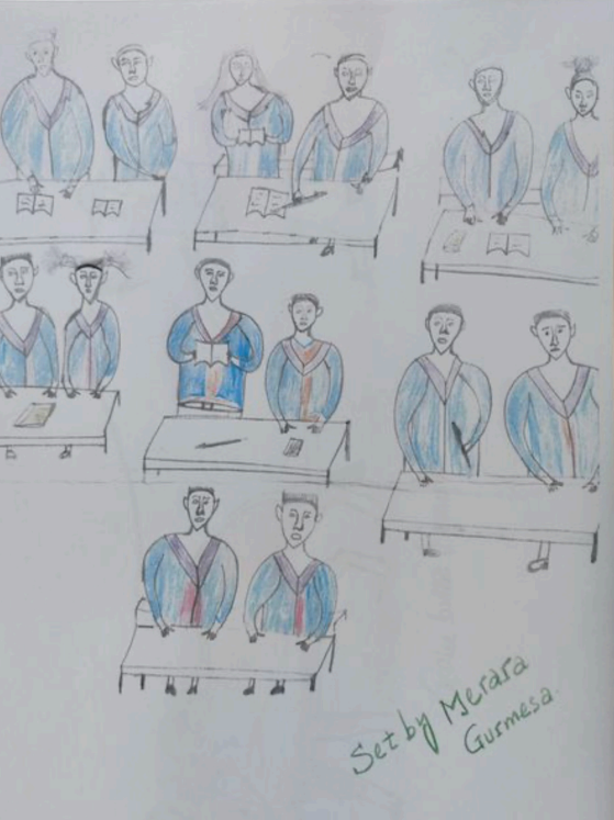 So entstand die Idee einer Schulpartnerschaft mit einer Schule in Afrika. Durch die Unterstützung des Welthaus Bielefeld bekamen wir schnell Kontakt zu einer Schule in Äthiopien, der Kotoba Secondary School, welche dörflich gelegen etwa 1,5 Autostunden von der Hauptstadt Adis Abeba entfernt ist. Über einen Briefwechsel erfuhren wir, dass die Schule ihren Strom ausschließlich über Generatoren produzierte und dass sie auf eine Solaranlage sparten. Unsere Schule wollte dieses Projekt unterstützen und organisierte unter anderem einen Sponsorenlauf und andere Events, bei denen bald eine beachtliche Summe zusammen kam. Nach etwa drei Jahren des Bestehens der Schulpartnerschaft konnte sich die Kotoba Secondary School inzwischen einige Solarpanels und auch einen neuen Schulcomputer kaufen. Zum Dank schickten uns die äthiopischen Schüler*innen einen großen Umschlag voller Zeichnungen, die Szenen aus ihrem alltäglichen Leben darstellen, sodass die künftigen fünften Klassen einen noch besseren, authentischen Einblick in das Leben in afrikanischen Ländern bekommen können.
